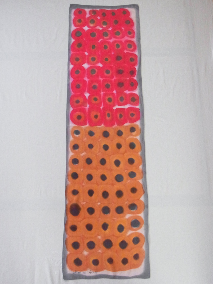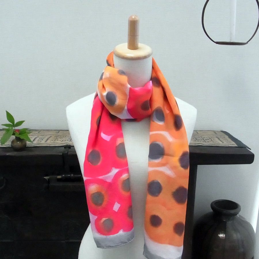 明るいピンクと鮮やかなオレンジを使っているのでインパクトがあるストールです。