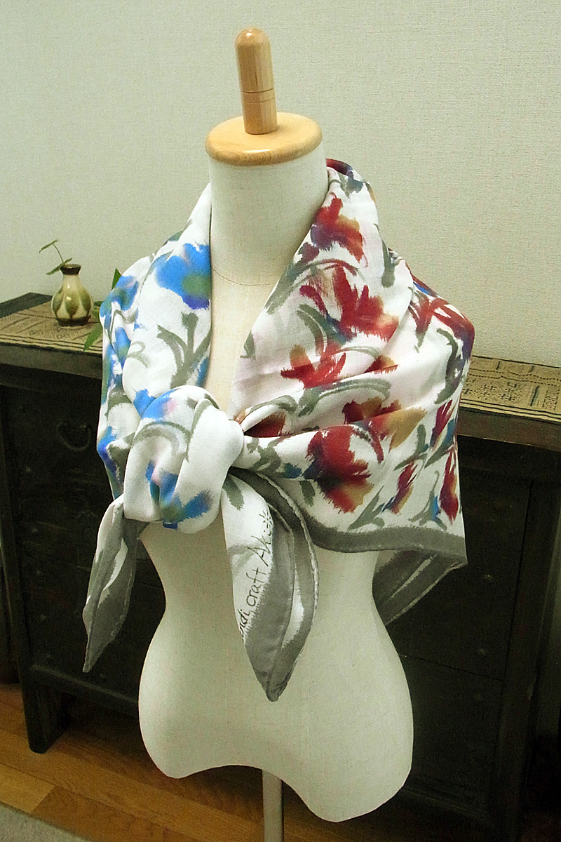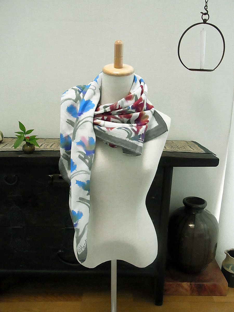 中心を境に赤茶と青の2配色で巻き方ひとつでいろいろな表情が楽しめます。