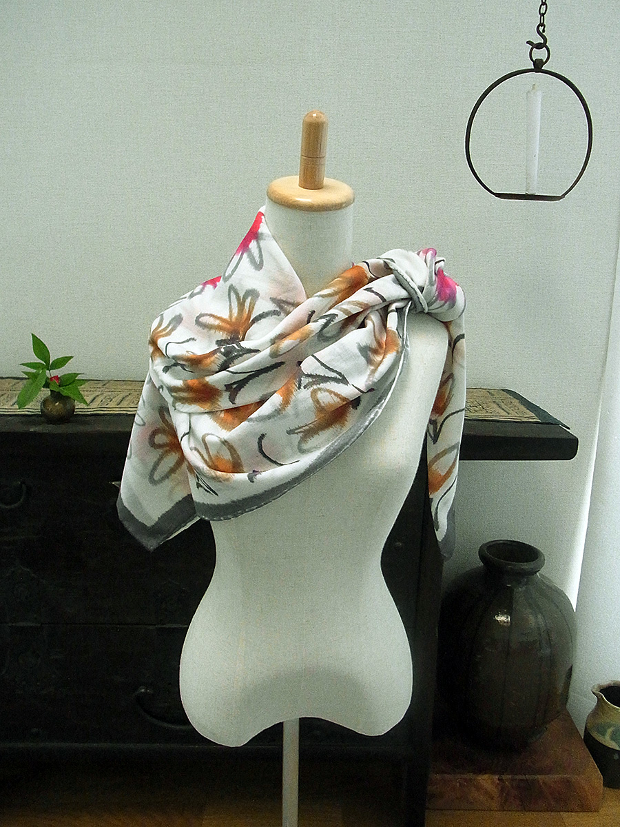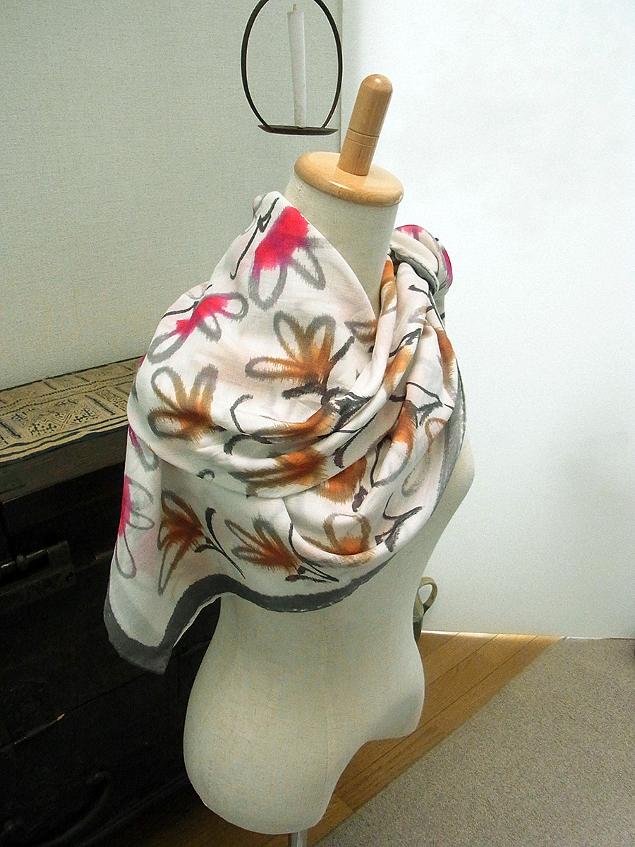 中心を境に黄土色とピンクの花柄の2配色で巻き方ひとつでいろいろな表情が楽しめます。